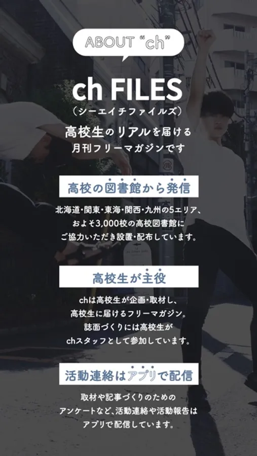 ch FILES(シーエイチ・ファイルズ)は、全国約3,000校、関東圏約1,100校の高校図書館で配布しているフリーマガジンです。たくさんの高校生が「chスタッフ」として記事づくりに参加しています。