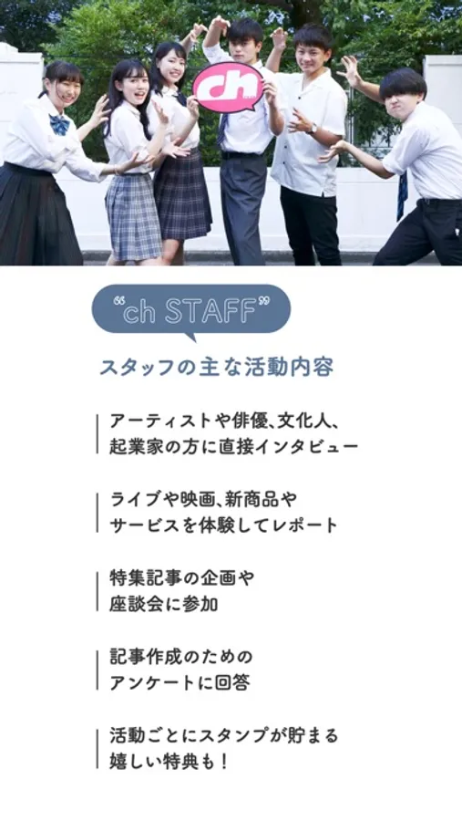 本アプリでは、ch FILES関東版が行う取材やイベントなど、最新情報やスタッフ向けの活動を案内しています。アプリスタンプが貯まると嬉しい特典がもらえるサービスも。chスタッフに登録して、高校生活を充実させよう!