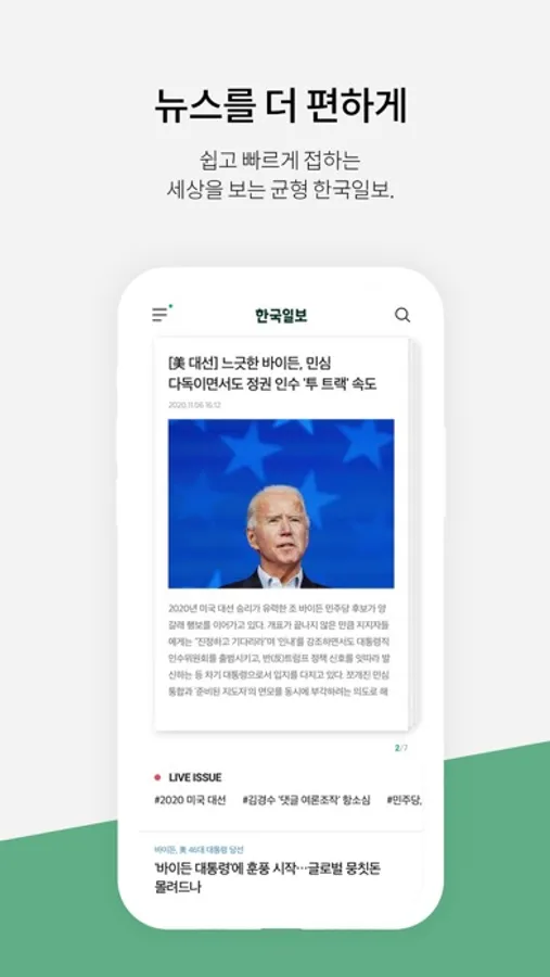 한국일보는 불편부당의 창간 정신 위에서 ‘신뢰와 소통’이라는 언론의 본질적인 존재가치를 구현하기 위해 끊임없이 변화와 혁신을 시도해 온 젊은 신문 입니다.
