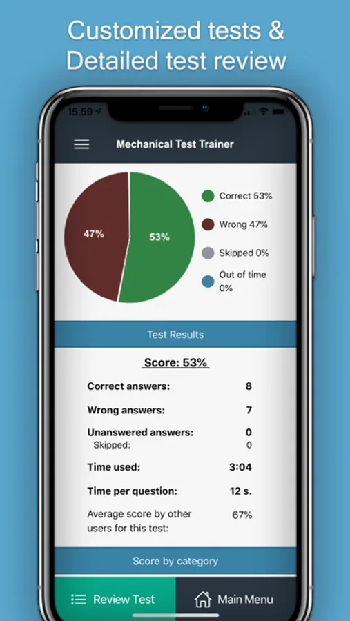 After each practice session your results with score are displayed, you can review questions and read a detailed explanation of almost every answer.