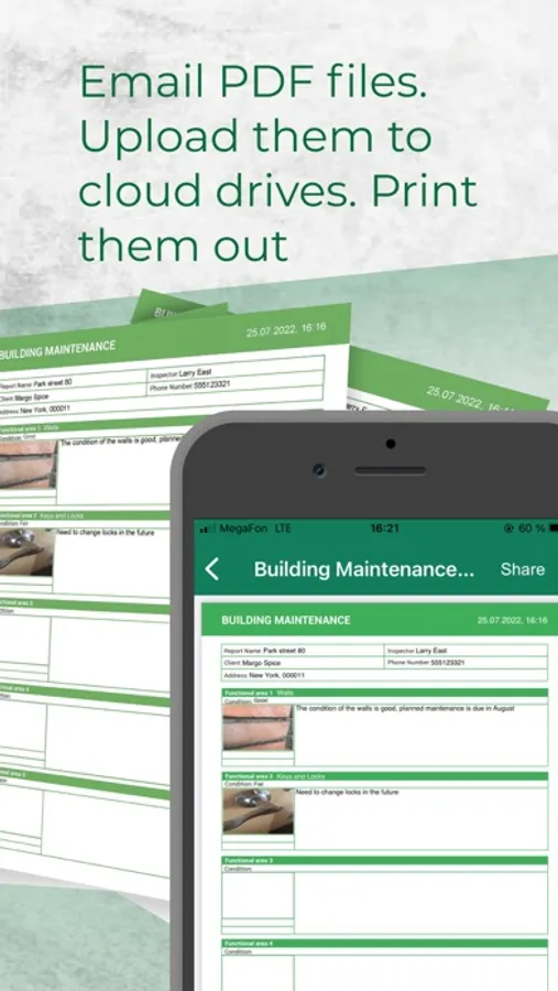 Add multiple details to your database including personal information, timestamp, geo location, take and upload pictures. Evaluate conditions of functional areas and create building service orders with your smartphone or tablet.