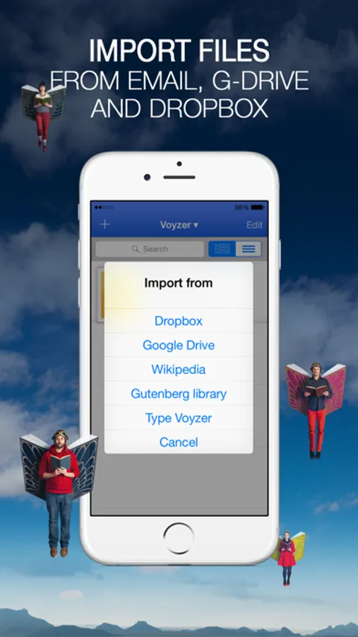 The all-in-one Voyzer Voice Reader supports reading PDF, non-DRM ePUB eBooks, Own typed files and Wikipedia. It is integrated with Dropbox, G-Drive and Gutenberg.