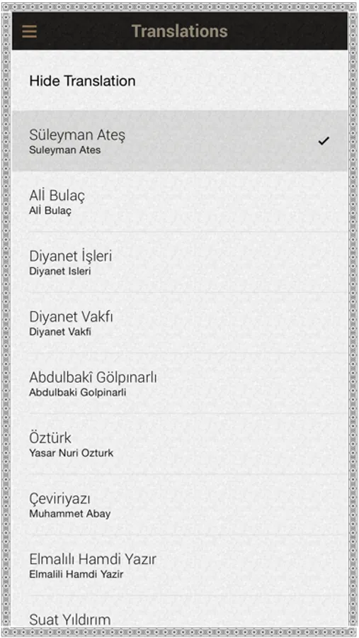 • Translations of famous Turkish translators Süleyman Ateş, Alİ Bulaç, Diyanet İşleri, Diyanet Vakfı, Abdulbakî Gölpınarlı, Öztürk, Çeviriyazı, Elmalılı Hamdi Yazır, Suat Yıldırım, Edip Yüksel.
