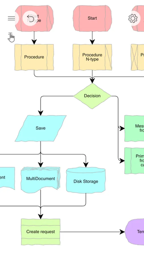 The app provides a unique set of shape behaviors for each diagram type. For example, windows and doors will automatically connect to walls in floor plans; shapes support automatic layout of children and collapsingexpanding of the hierarchy levels in org charts and mind maps. Connections auto-routing logic also depends on the diagram type.