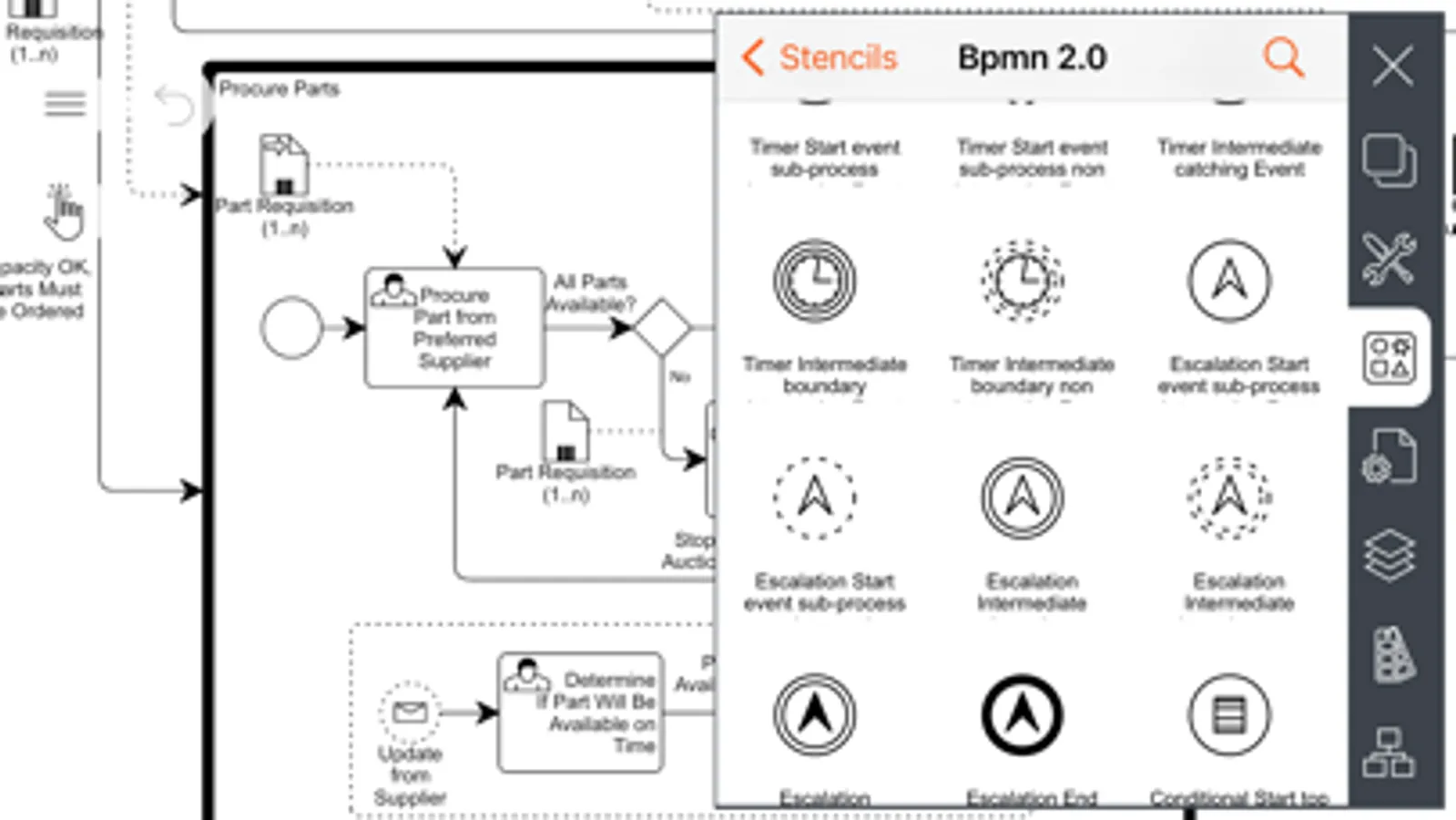 You can create basic shapes and connections very quickly thanks to the freehand drawing recognition. For complex drawings, there are hundreds of ready-to-use stencils on the toolbox that can be easily dragged to the canvas. Most of these stencils are not just static images, but complex objects with plenty of properties setting up their appearance and behavior in the designer.
