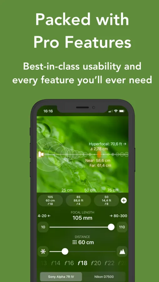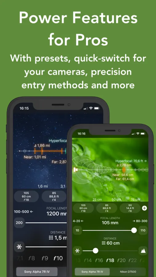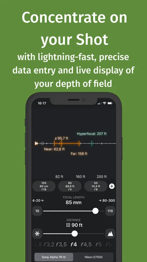 FocusFinder for Apple Watch (included) brings depth-of-field calculations to your wrist. You enter settings with the Digital Crown and instantly see the effects on your depth-of-field. Visualizations were designed specifically for Apple Watch, to make maximal use of the available space. Cameras are synchronized to your main device.