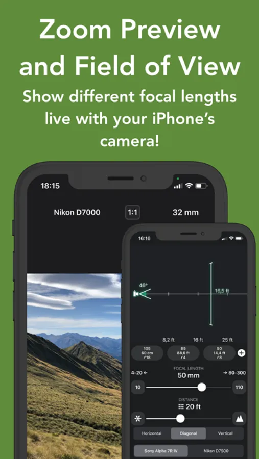 On top, FocusFinder helps you to quickly choose lenses by simulating the focal length with your device’s camera, and it calculates the angle of view for your focal lengths. You‘ll see what effect your focal length and the camera body has on the final frame.