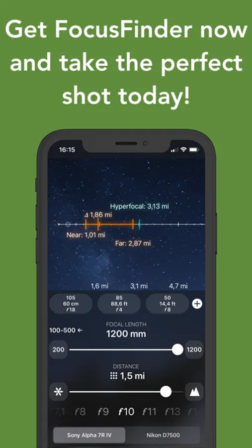 FocusFinder calculates at which distances objects will be in focus (i.e., perfectly sharp), and shows you how blurry they will be beyond that. It also shows the hyperfocal distance, to help you get distanced objects perfectly in focus. All this is presented in an intuitive chart, so you can focus on your shot, not your device. You enter the values quickly with the sliders, or manually, for even more precision. To see how different camera settings affect your shot, you can quickly adjust them and view the changes live!