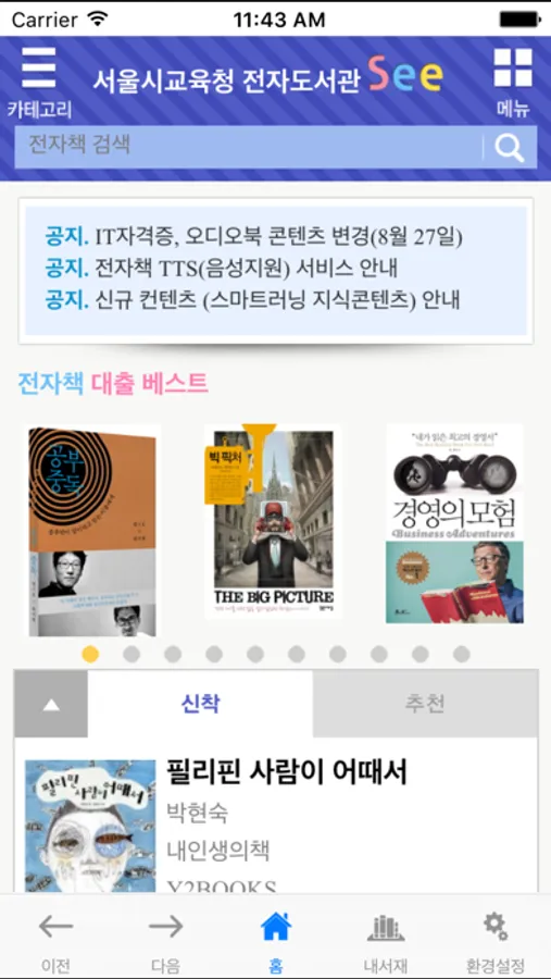 서울특별시교육청의 전자도서관 모바일 서비스입니다.