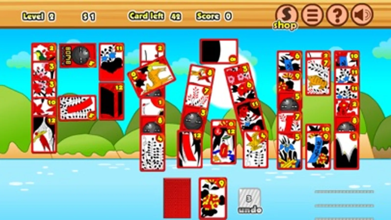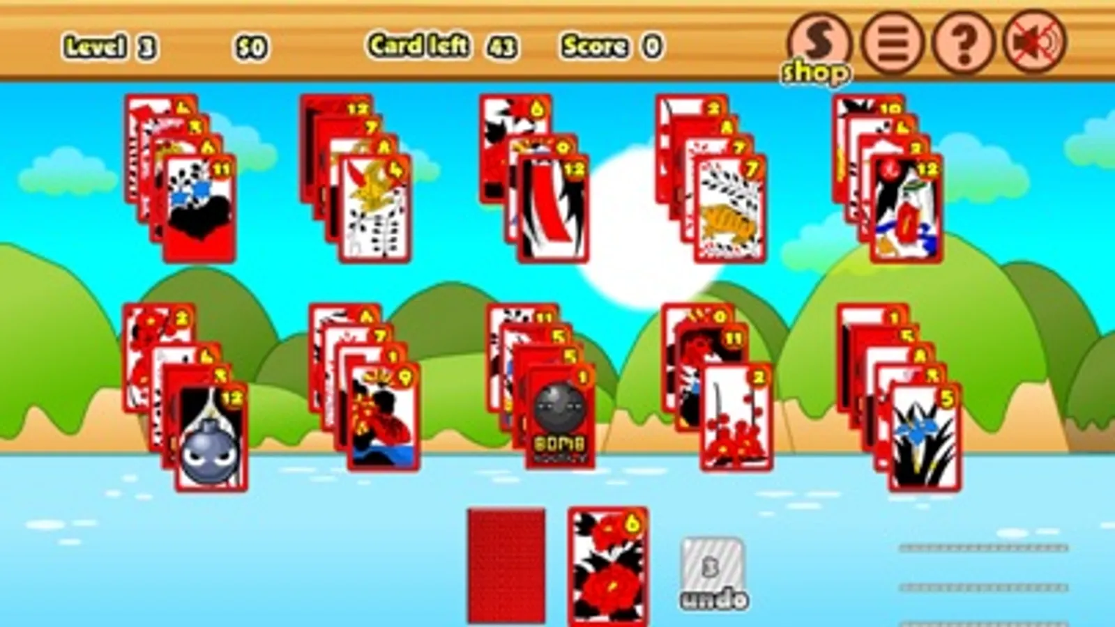 Clear all the cards from the board! Eliminate one card from the screen pile by tapping the number higher or lower than the number shown at the bottom of the screen. The cards that are left on the screen determine your score and the number of stars you will receive. No cards left gives 3 stars, 1 card left gives 2 stars, and 2 cards left gives 1 star, if neither of those, you have to try again! Make good use of the bombs to change the order of the numbers when you're in a pinch. You cannot undo the usage of the bombs so be careful!