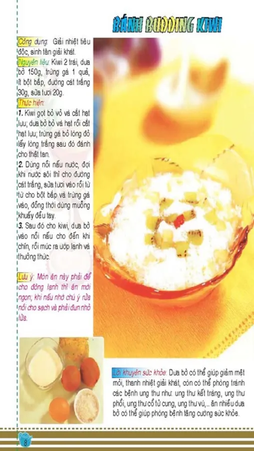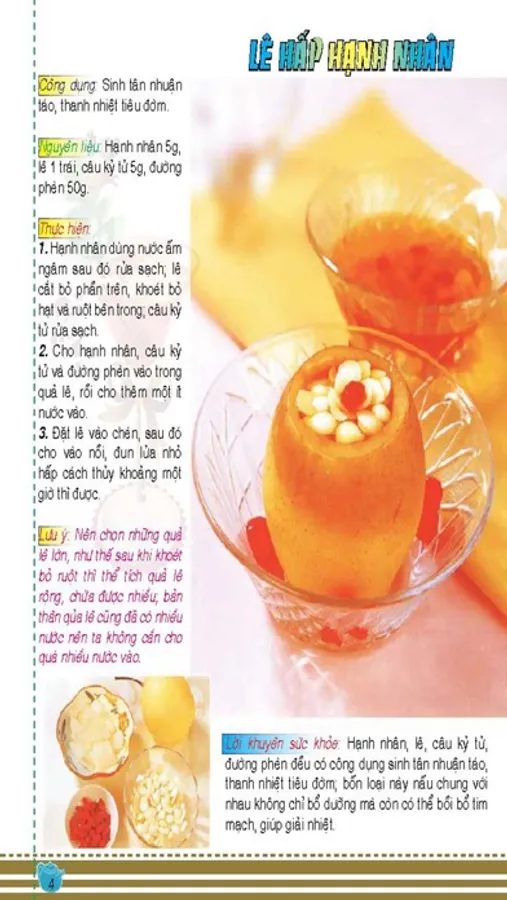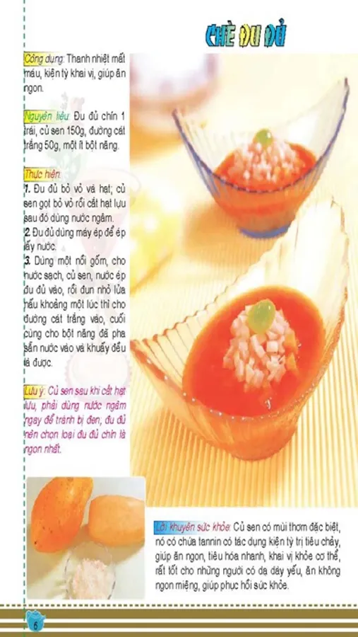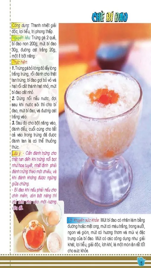 Những ngày hè nóng bức thường làm cho ta cảm thấy ăn không ngon miệng, lâu ngày rất dễ dẫn đến tình trạng thiếu chất dinh dưỡng, thể lực suy giảm, tinh thần mệt mỏi; cuối cùng sức đề kháng giảm sút. Vậy phải làm gì để có thể giải nhiệt cơ thể, ăn ngon miệng hơn? Lúc này nên hết sức tránh những loại thức ăn có tính nóng, và chọn những loại chè mát để cải thiện thói quen ăn uống, điều tiết lại khả năng hoạt động sinh lý của cơ thể, còn giúp ta phục hồi sức khỏe. “Những món chè giải nhiệt dễ nấu” giới thiệu đến quý độc giả hơn 30 loại chè giải nhiệt khác nhau, giúp bạn có thể thoải mái lựa chọn, thưởng thức những món ngon trong mùa hè nóng bức. Nó giúp bạn có trong tay 4 bí quyết từ cách chọn nguyên liệu, cách thực hiện, các điểm cần lưu ý cho đến các lời khuyên về sức khỏe. Sách đã chỉ ra những cách thực hiện khá đơn giản thêm vào đó tất cả các món trong sách đều có hình ảnh minh họa cụ thể nên dễ thực hiện.