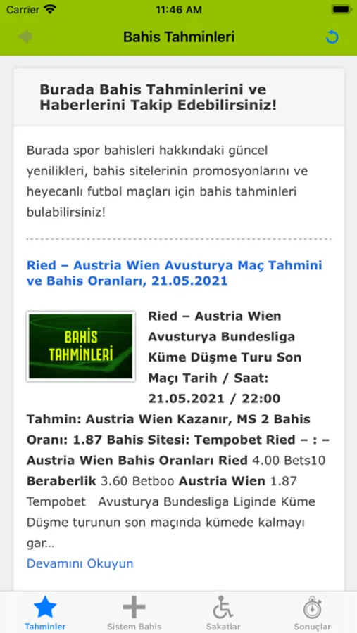 Spor bahisleriyle ilgilenenlerin dikkatine! Online bahis sitelerinin bu mobil uygulaması başarılı bir bahisçi olabilmeniz için çok geniş bilgiler içermekte. Bahis konusunda tecrübeli olan ekibimizle birlikte her zaman güncel haber ve tahminleri takip etme şansınız var. Başta Türkiye olmak üzere İngiltere, Almanya veya İspanya gibi çok farklı ülkelerin liglerini de kapsamakta olan sitemizde futbol haricinde başka spor dallarına da yorumlar yapılmakta.