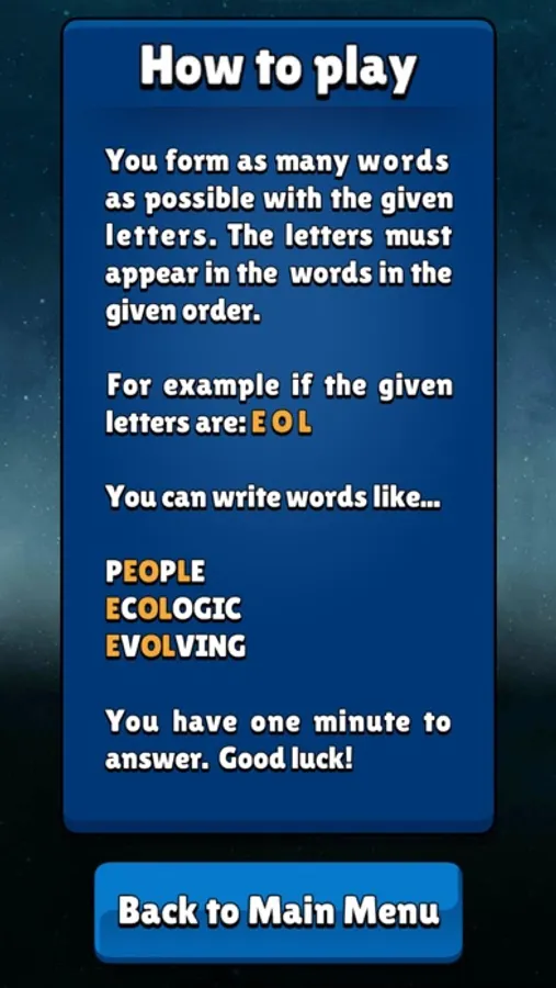 The game will give you one, two or three letter combinations. You form as many words as possible with the given letters. The letters must appear in the words in the given order. You have one minute to answer. Good luck!