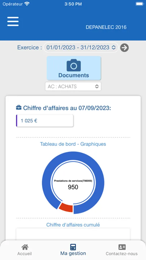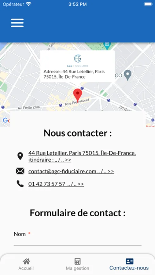 Notre application vous permettra d'accéder à votre comptabilité en ligne, à l'actualité juridique fiscale et sociale et de nous géolocaliser