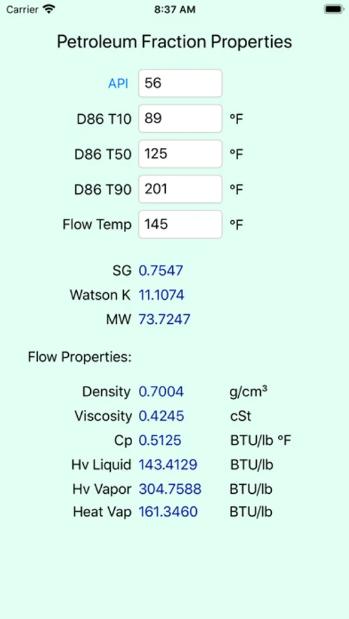 PetroFrac calculates properties of refinery petroleum fractions based on the D86 distillation and API gravity. You enter the 10%, 50% and 90% D86 distillation temperatures along with the API gravity.