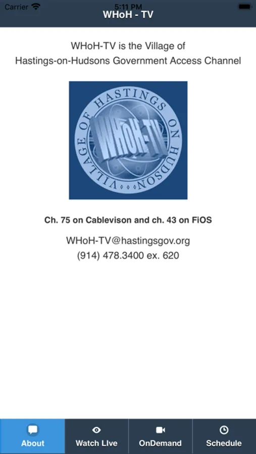 The official app for WHoH-TV. WHoH-TV, ch. 75 on Cablevison and ch. 43 on FiOS, is the Village of Hastings-on-Hudsons Government Access Channel.