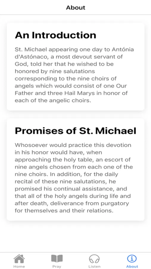 This app features the Chaplet of St. Michael the Archangel. You can listen to it while you drive in the car (does use cell data). You can also pray decade by decade and listen to the audio and follow along each highlighted bead. Download the app to read about the blessings of praying this chaplet.