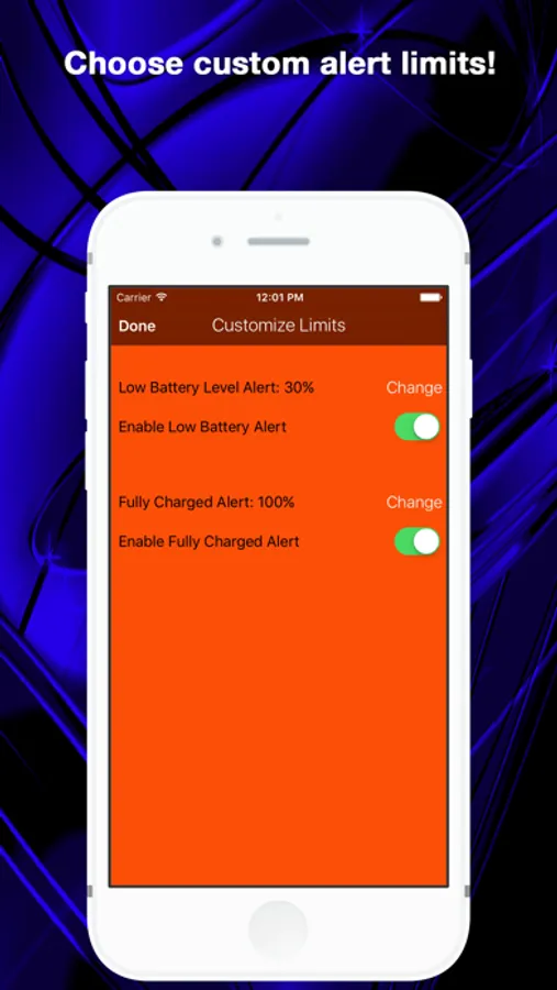 - Customize the alert limits of the battery level