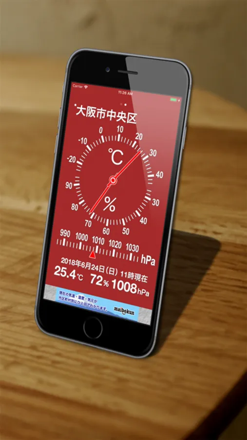 現在の気温・湿度・気圧が見やすい大きなアナログ表示。