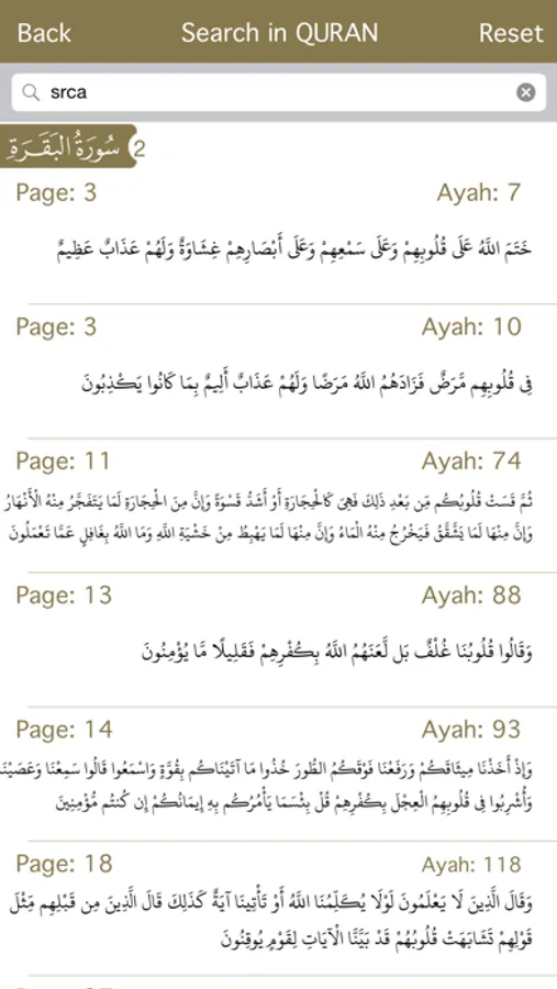 Surah Listing to quick jump to any Surah. Press i button with surah name to get list of all aya numbers in that surah and single tap to jump to specific ayah.