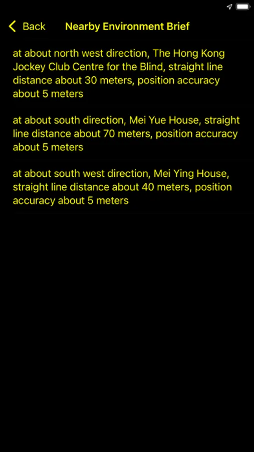 The "My Location" service and the location information (including current location, position accuracy, straight line distance, etc) provided by "VoiceMapHK" are estimated by the built in GPS. The estimated location provided by built in GPS of mobile device may deviate from actual location. The GPS accuracy could be affected by various factors, and normally the positioning accuracy of built-in GPS of smartphones ranges from 5 metres to 500 metres. In some cases (such as located indoor or under limited sky window), the estimated location provided by built in GPS of mobile device may deviate from actual location for 1000 metres or even more.