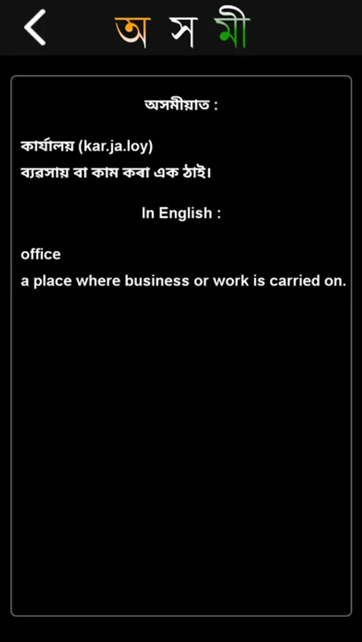 Axomi is the World's first ever English-Assamese Dictionary App. It does the simplest dictionary operation from 'English to Assamese' and from 'Assamese to English'. The database used has been provided by xobdo.org and is completely for offline usage.