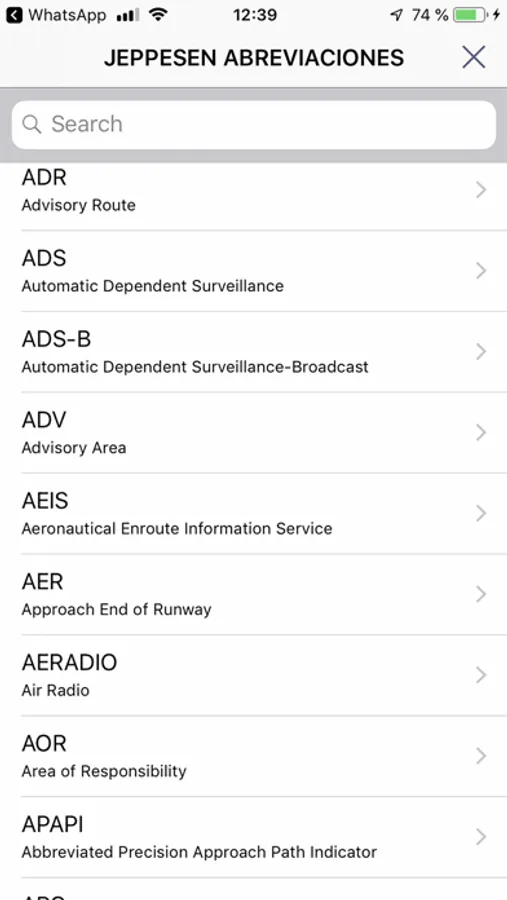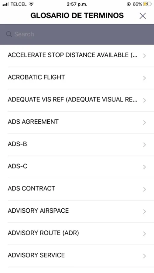 PilotoProTest Lite ofrece un glosario de términos de aviación con búsqueda rápida el cual incluye más de 3989 abreviaciones de aviación.
