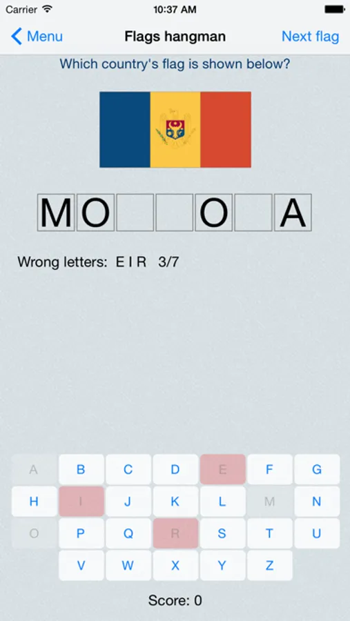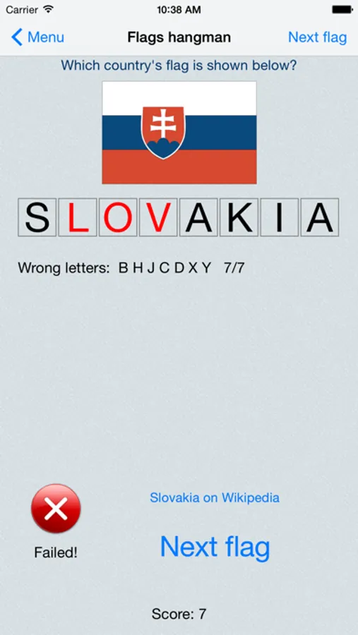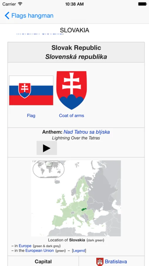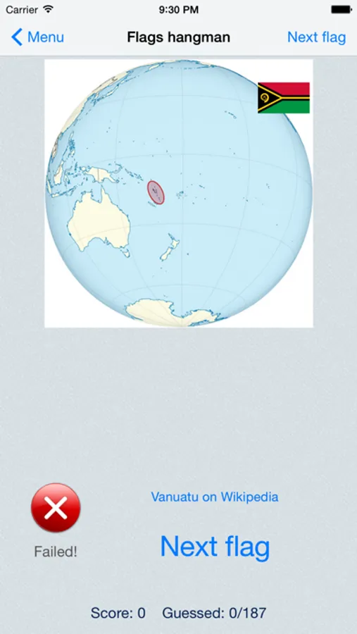 Flags hangman is a hangman-style word game for guessing flags of countries. It can be used as a geography quiz to learn flags. After guessing flag, it shows the map of the country and you can click Wikipedia button to show country information from Wikipedia.