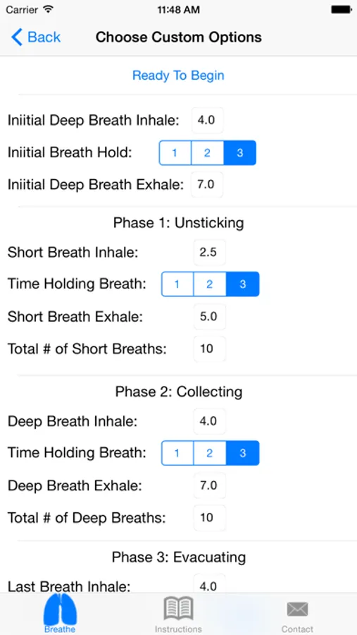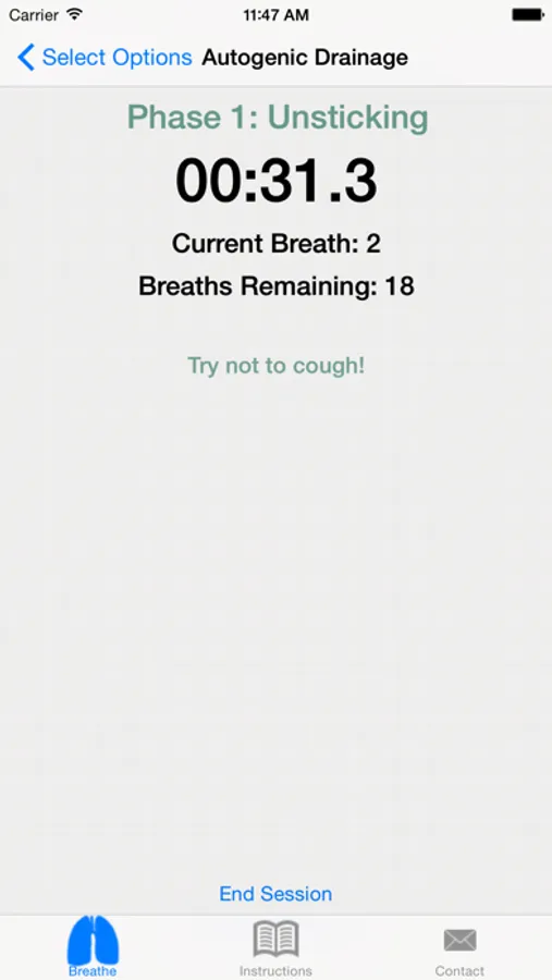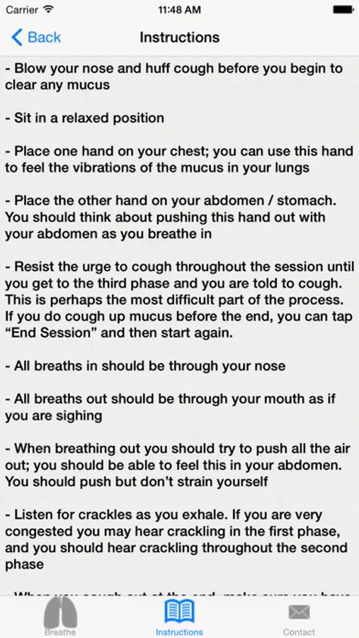 This app contains a default autogenic drainage session that was customized by a person with cystic fibrosis and also contains a fully customizable session if the defaults do not work for you. You can customize the length of every inhale, exhale, time holding your breath, and total number of breaths in each phase of autogenic drainage. Hit start and voice commands tell you when to breathe in, hold, and breathe out. The timer also displays how long your session is, the current breath number, and how many breaths you have remaining. The app also contains a reference section.