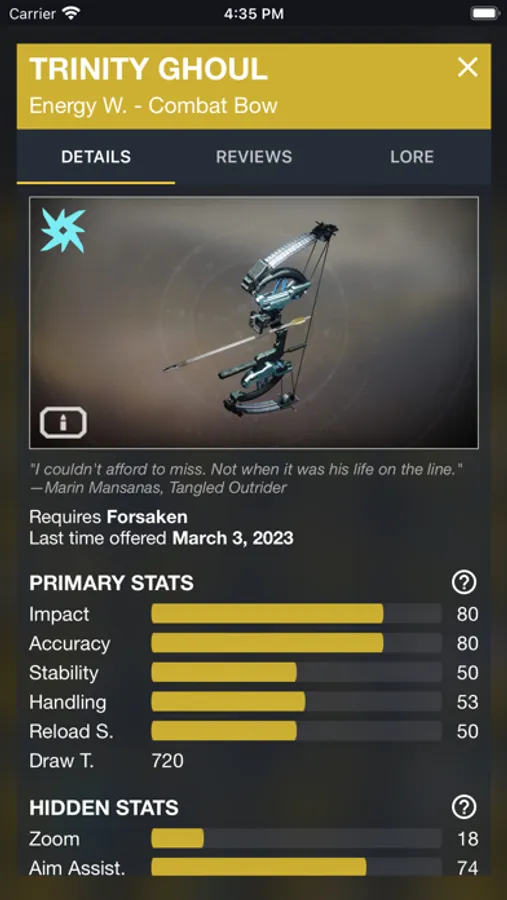 - Weapon & Armor Details: See all the stats and perks of a weapon or armor in detail.