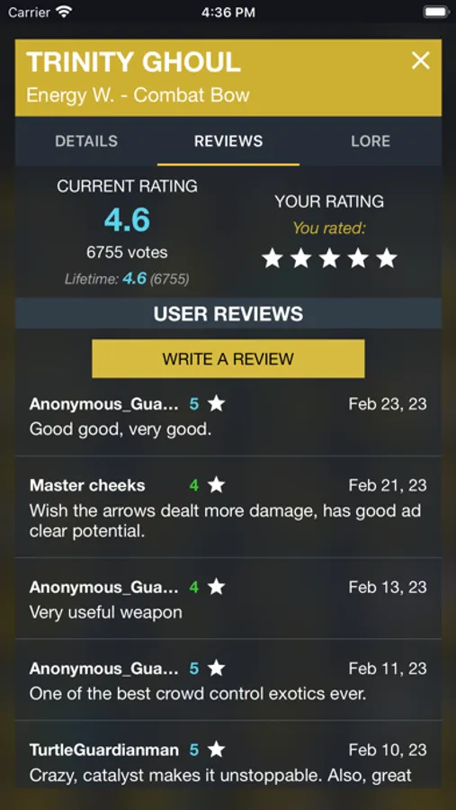- Weapon & Armor Ratings and Reviews: Give ratings to exotic items and write reviews on them. Check what the Destiny community thinks about a specific exotic and decide to buy it or not accordingly.