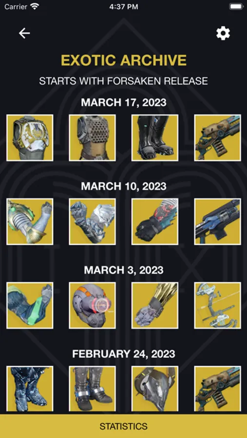 - Archive: Check what Xur has brought in previous weeks in an orderly fashion. Instantly see how many times a particular exotic item is brought by Xur. Archive starts with Forsaken release.