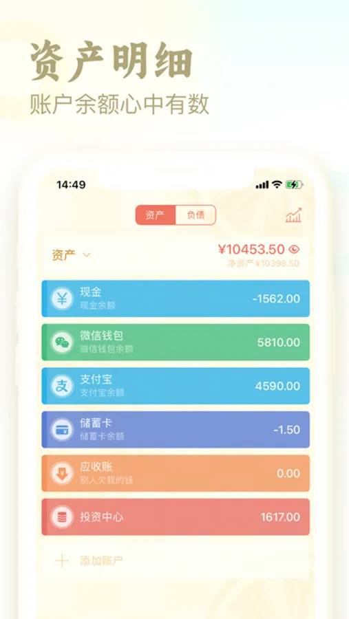 5、提供资产管理,随时展示信用卡、支付宝等账户余额情况;
