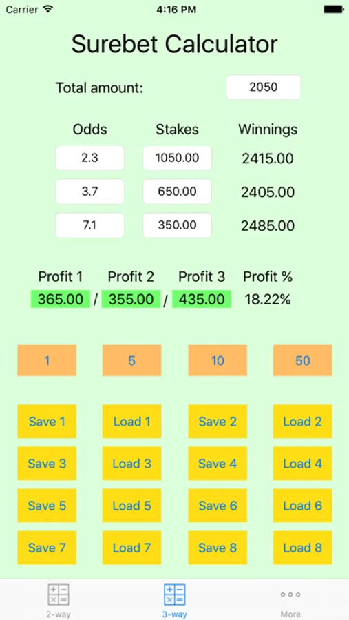 - Rounding: Now you can round your surebets to 1,5,10 or 50 and the app shows you how much you can win for each outcome when rounding.