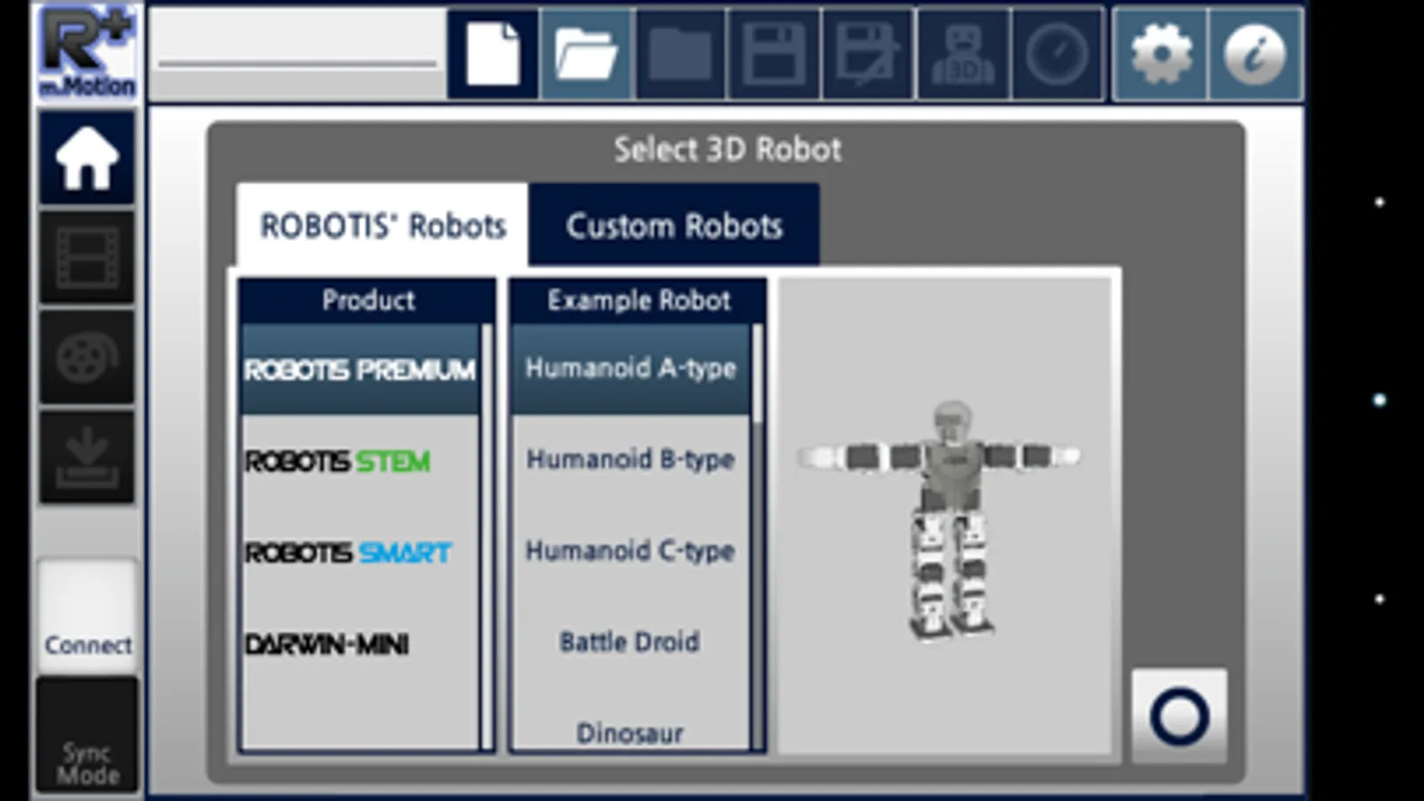 ROBOTIS R+ m.Motion allows motion editing and download for educational robots; such as SMART, STEM, ROBOTIS MINI, and PREMIUM.