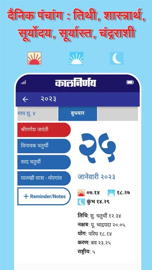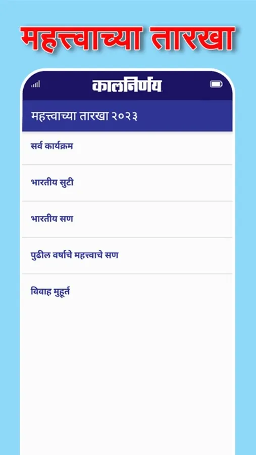 Kalnirnay is a calmanac for solar as well as vedic lunar events. It shows lunar dates and year along with regular dates and year. Events are shown in a local language.