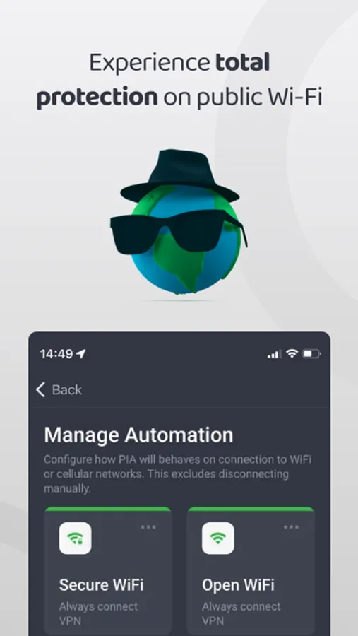 - Per-Network Settings: Automatically enable the secure VPN connection when rejoining to an unsecure WiFi network.