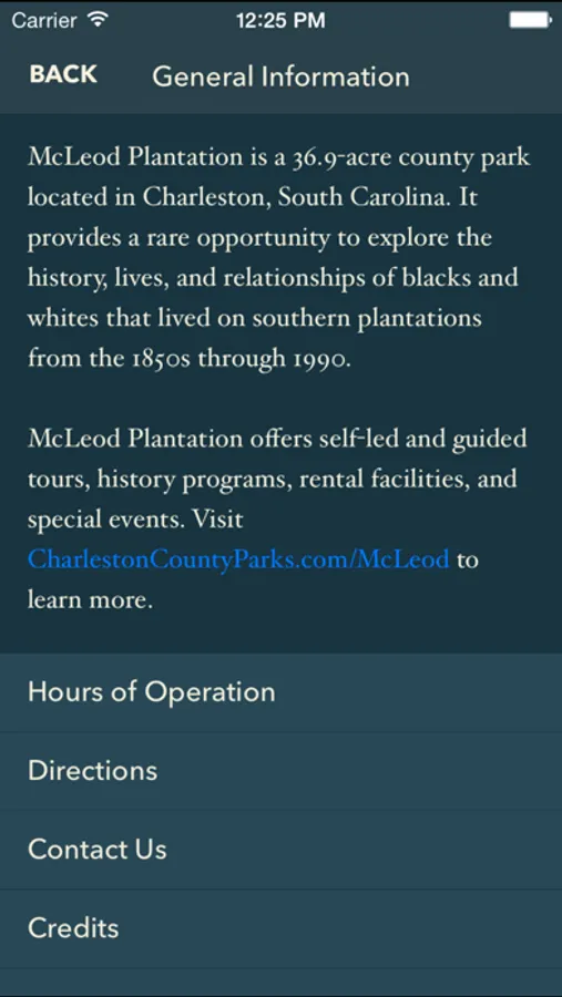 All McLeod Planation Historic Site App content is the exclusive property of Charleston County Park & Recreation Commission or its service providers and is protected by copyright, trademark and other intellectual property laws, regulations and standards. Except as expressly permitted herein, these materials may not be copied, reproduced, or distributed for commercial purposes, nor may these materials be modified, uploaded, downloaded or reposted, in whole or in part, to other applications or websites. You may not reproduce, modify, distribute or publicly display the Application or the McLeod Planation Historic Site content, in whole or in part, except as is expressly authorized by these Terms of Use. If you would like to make copies of and/or distribute any portion of the Application or the McLeod Planation Historic Site App content in any way not expressly authorized by these Terms of Use, you must contact CharlestonCountyParks.com for written permission, which it may grant or withhold in its sole discretion. You may not use or reproduce any trademark, trade name or service mark appearing on the Application without the prior written consent from Charleston County Park & Recreation Commission.