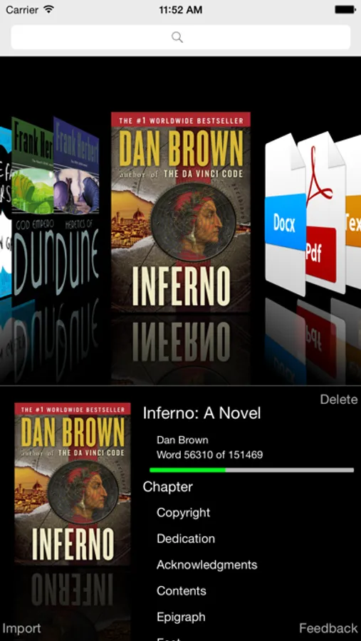 Wear Reader can import books from Dropbox or iCloud. Now import azw, azw3, azw4, cbc, cbr, cbz, chm, docx, fb2, htm, html, htmlz, lit, lrf, mobi, odt, pdb, pdf, pml, prc, rb, rtf, snb, tcr, txt, and txtz! NOTE: Wear Reader CANNOT import books directly from iBooks.