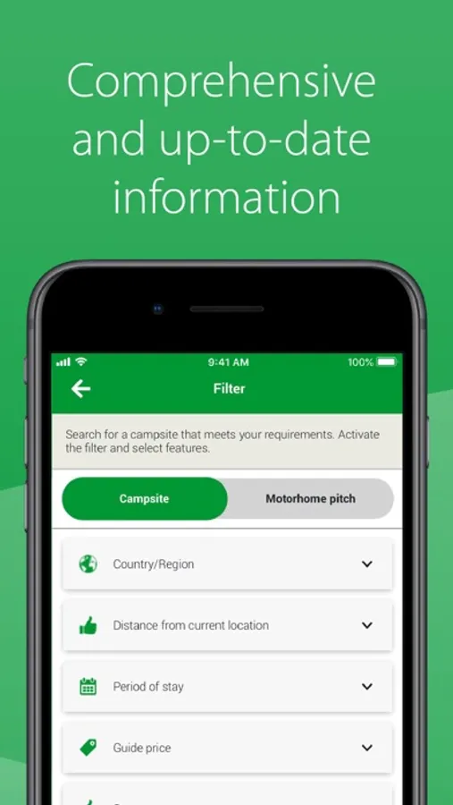 Thanks to handy filters, it is very easy to find a place to stay and more and more campsites have made it possible for you to use the app to book a pitch directly. Or save your favourite campsites so you can easily find them again later. Thanks to the free updates, including amendments and new campsite reviews, the app is always up to date.