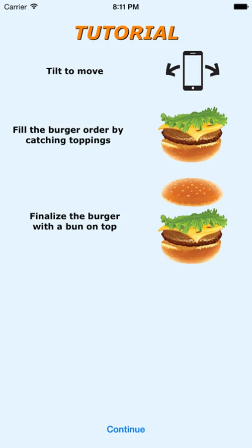 Kids learn hand-eye coordination by tilting the device to move the burger. Tilt sensitivity can be adjusted for all skill-levels.