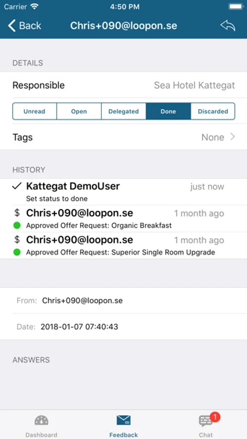 The Loopon Mobile app gives you the possibility to respond to guest feedback, delegate issues to someone else at your hotel and forward feedback to your colleagues.