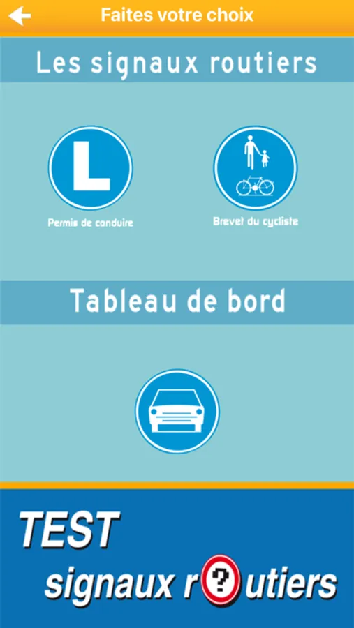 Le Test Signal Routier propose deux niveaux : « permis de conduire » et « brevet du cycliste ». Le niveau « permis de conduire » permet d’apprendre la signification juridique des signaux routiers. Le niveau « brevet du cycliste », qui est destiné aux jeunes cyclistes, propose des définitions plus simples. Ici, on focalise sur les actions à prendre auprès d’un signal routier déterminé.
