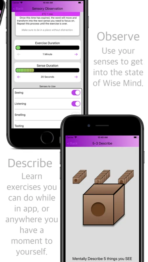 • Sensory Observation: A little game where you see a word appear on the screen indicating a sense. By playing this game, you can quickly become more in tune with your senses. For newbies, this can be a life changer. For people already accustom to practices such as Mindfulness, it can simply be a great daily exercise to warm up for the day, or even wind down at night.