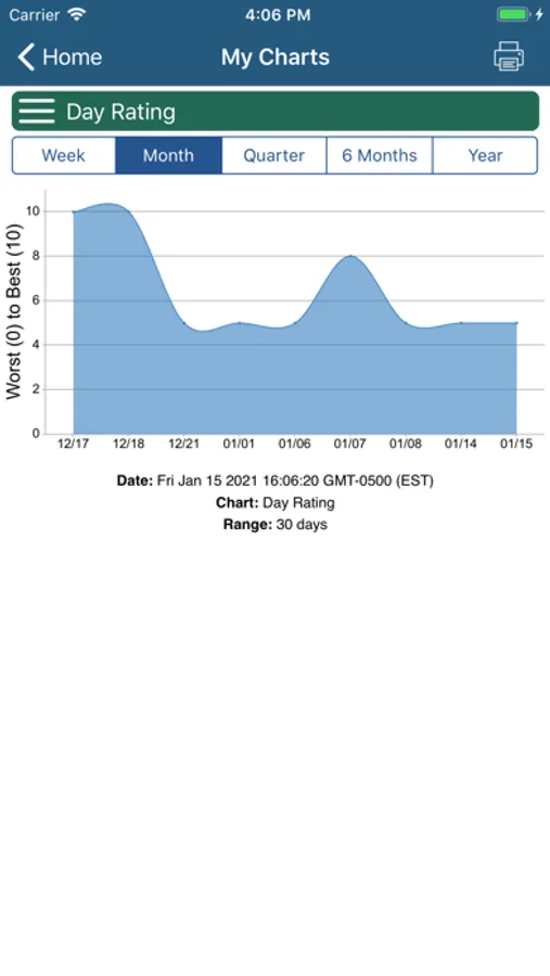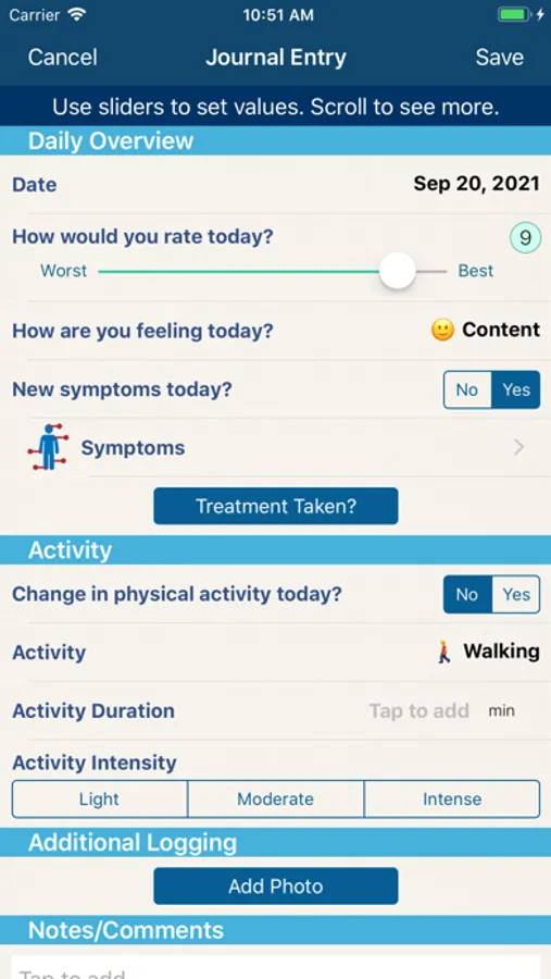 • Track your progress and symptoms by filling in the daily journal with its sliders and buttons and watch your data transform into easy-to-read charts