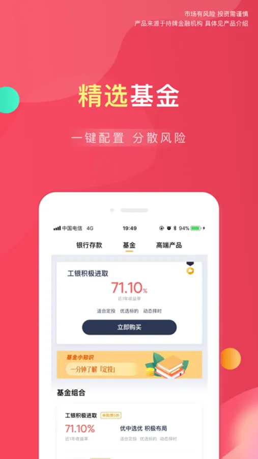 银行存款、基金组合、高端产品等,兼顾风险和收益