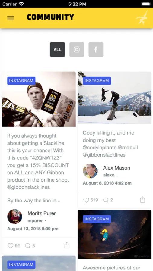 All Facebook, Twitter, YouTube and Instagram channels of the GIBBON Family packed into one filter based overview. Be always up to date and don´t miss attractive offers and activities which GIBBON has to offer together with the global Slackline family. Take part in sharing content and having your posts added to this hub.