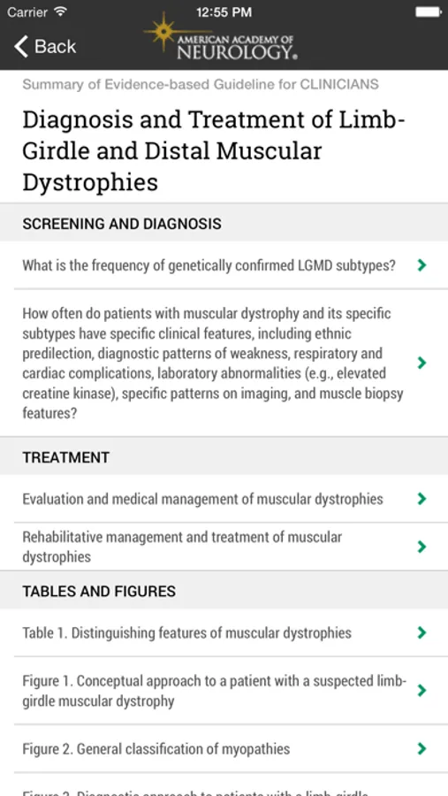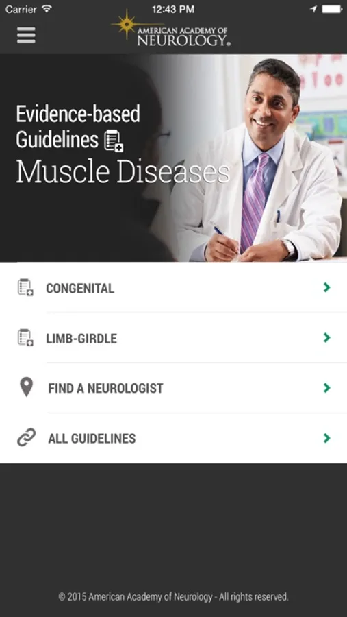The American Academy of Neurology (AAN), representing more than 28,000 neurologists and neuroscientists worldwide, is the trusted name in evidence-based guidelines for diseases of the brain and central nervous system. The AAN Muscle Disease Guidelines app includes “Diagnosis and Treatment of Limb-Girdle and Distal Dystrophies,” published in the AAN’s leading scientific journal Neurology®. Download the AAN Muscular Disease Guidelines app for iOS/Android.