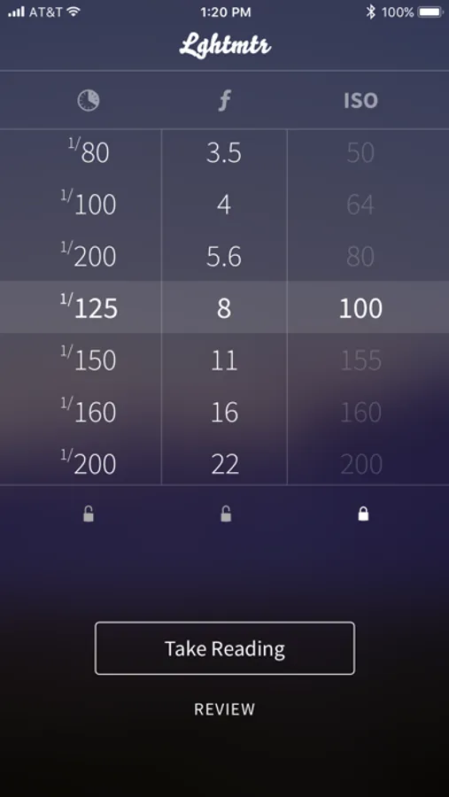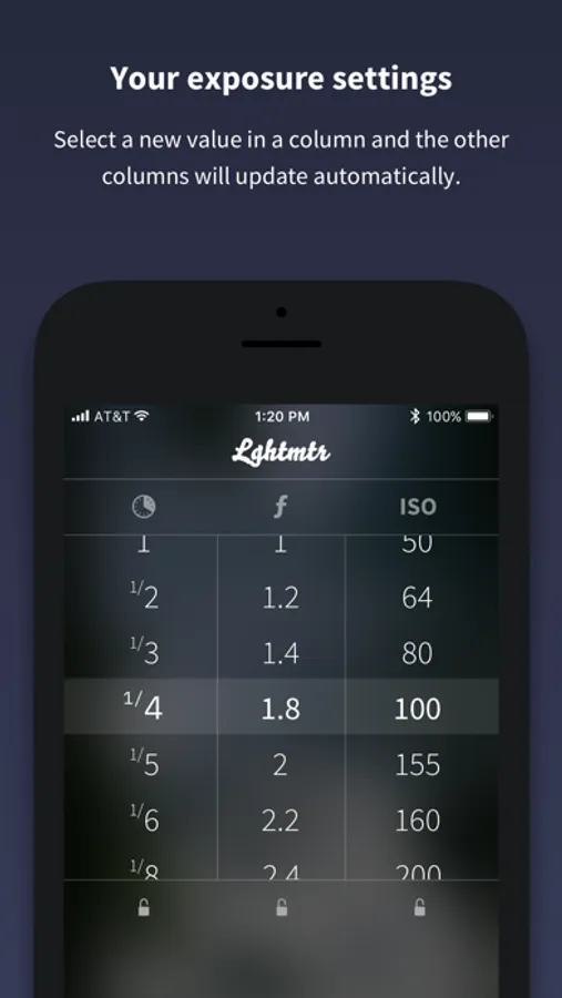 Take a reading of a scene, and then the initial exposure settings are shown. When you adjust one value, the other values will update. At any time you can lock a value from changing. You can also review the image which your exposure settings are based on.