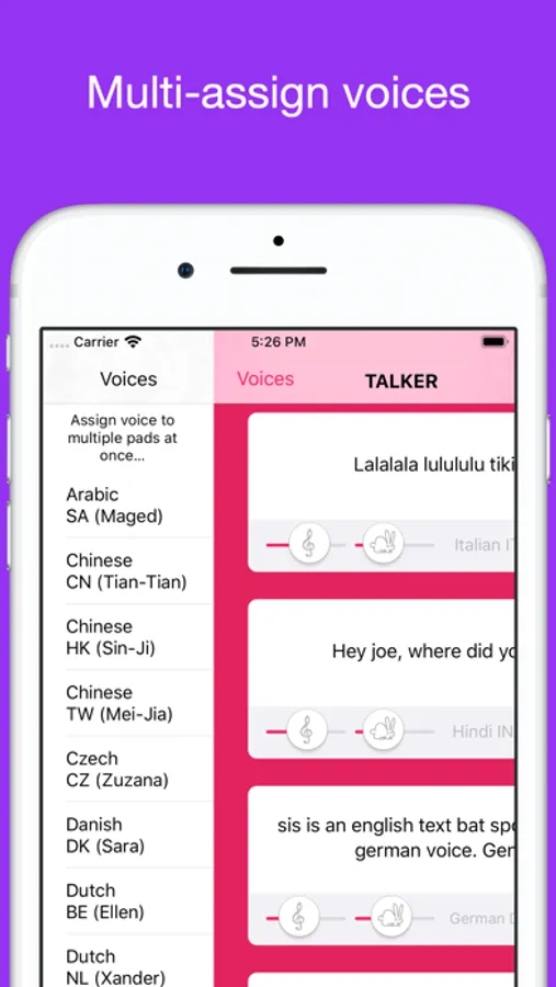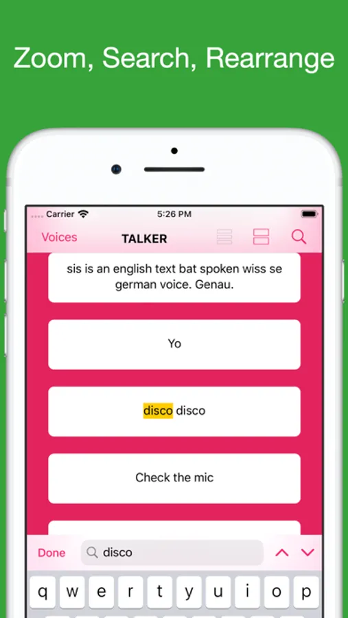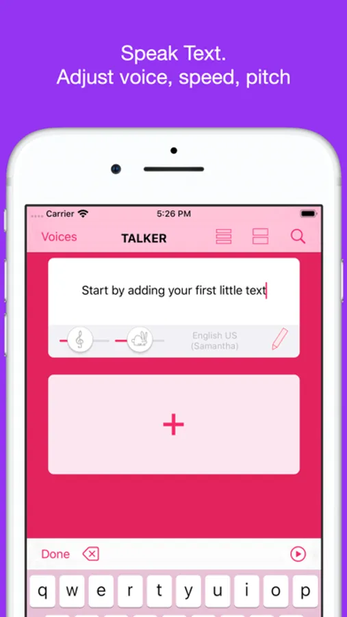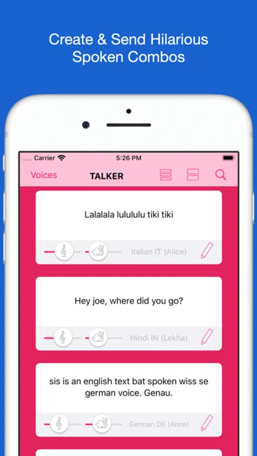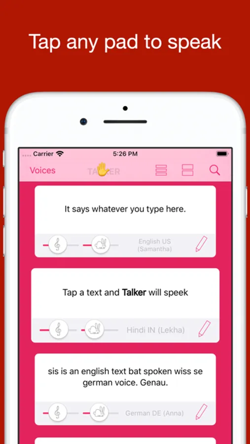 Talker gives you a soundboard for text. Just tap a pad to have it speak. You can individually tweak voice, speed and pitch. The soundboard layout makes it easy to compose sequences. You can already tap the next pad while one is playing.